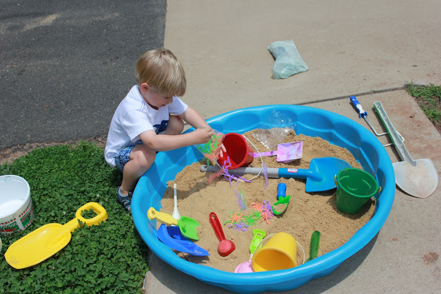Fun and easy sensory pool to have fun with the kids. If you like to do this kind of stuff you should hop on over to Growing a Jeweled Rose, she has a great construction set up with deer corn instead of sand.