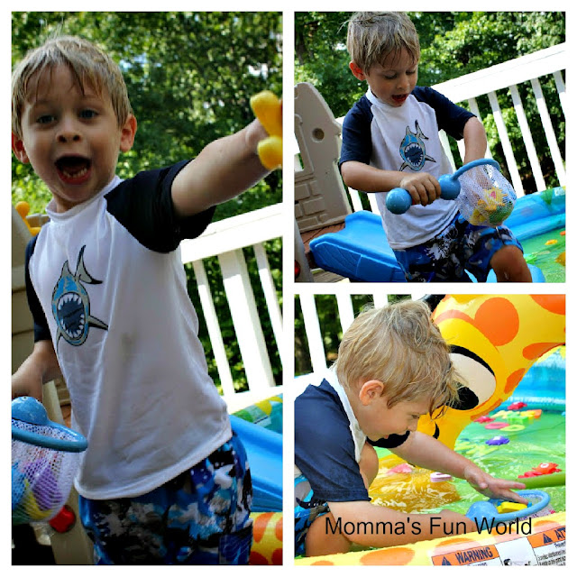 On this HOT summer day we were playing in the pool and I wanted to throw in a little learning fun. So I filled the pool up with all the letters we have and we scooped up letters. Then dumped them out to see if we could spell words.